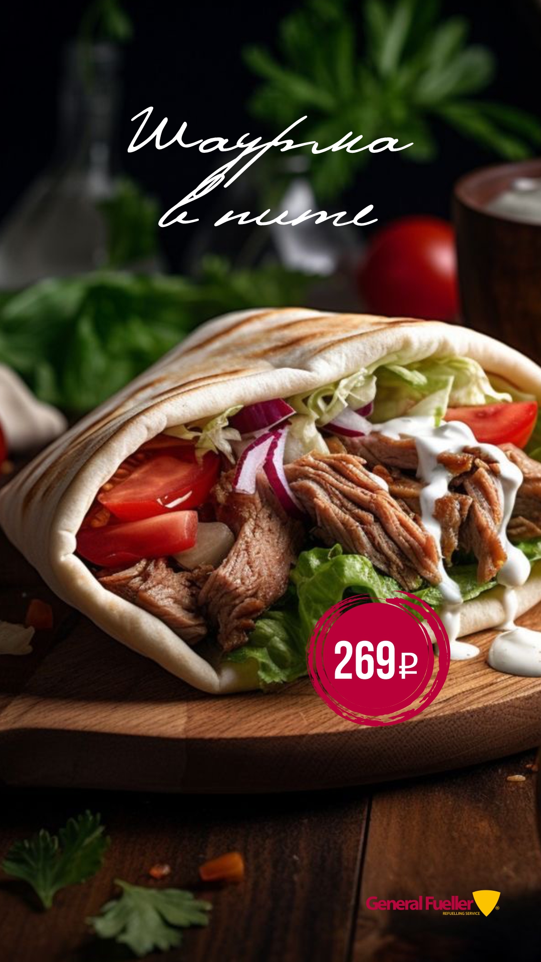Шаурма в пите за 269 рублей для всех Гостей АЗС GF 18. Товар представлен только на АЗС GF 18.
