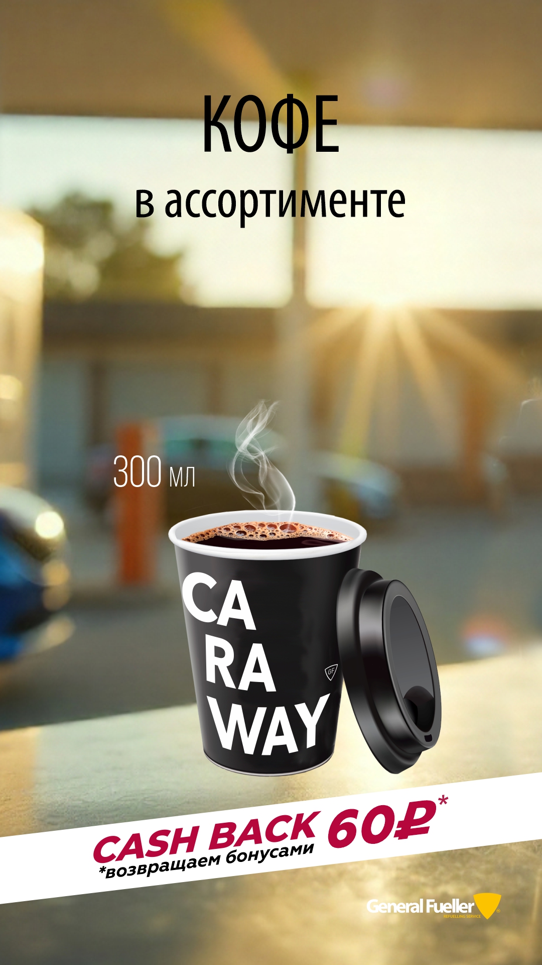 Кофе 300 мл с кэшбэком 60 рублей бонусами для Гостей АЗС GF с приложением CARAWAY.