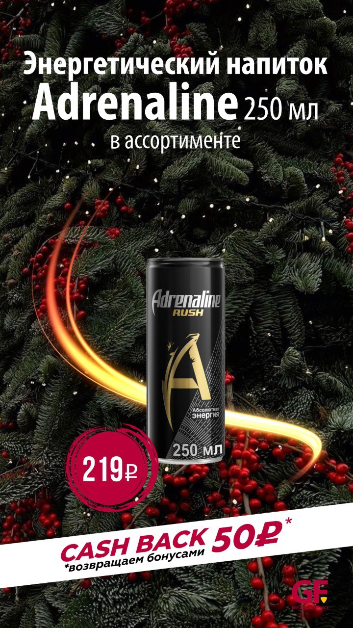 Энергетический напиток Adrenaline 0,250 л за 219 руб. и кэшбэк 50 рублей бонусами для Гостей АЗС GF с приложением CARAWAY.